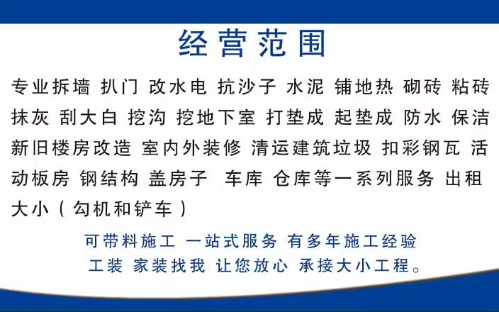 承接:家装 工装 硬化地面 砌墙 盖房子 车库 仓库等一系列服务可大包 ,(有室外吊)楼上吊沙子、水泥瓷砖等、做防水,安装光伏太阳板,围栏,护栏,高速围挡等(微挖小勾机出租)